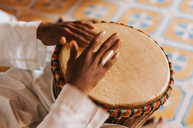 Following the sound, he found an old man sitting under a colorful tent. He was playing a round, shiny drum.