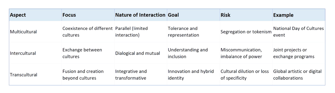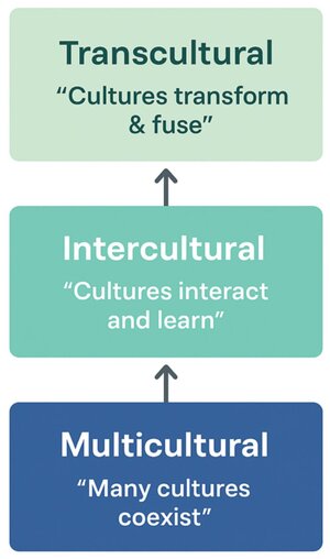 This paragraph explains the conceptual and practical differences among multicultural, intercultural, and transcultural aspects, which are fundamental to understanding diversity, dialogue, and transformation in education, culture, and society. The progression from multicultural to intercultural and transcultural represents a movement from coexistence, to communication, to innovation.
