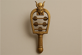 He approaches his friend, holding a strange instrument made with a vertical metal rod and three horizontal ones. He strikes it, making it resonate loudly. She, she, she, she…Then, whispering in Khalid’s ear, he says: “Do you want to know something fantastic? Listen… If a group of children each play their own sistrum, all together, the goddess Hathor appears, the goddess of joy, beauty, music, dance, love, sweet as a mother…”